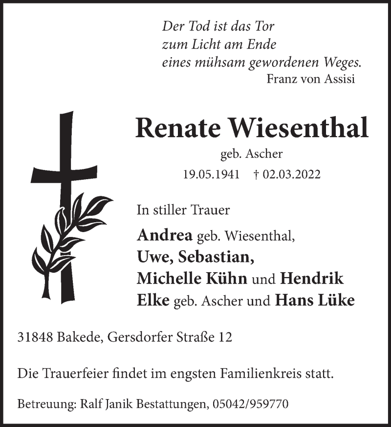Hier finden Sie alle Traueranzeigen aus der Zeitung, die bisher für Renate Wiesenthal erschienen sind. Weitere Traueranzeigen, die in der Zeitung erscheinen, werden hier ebenfalls aufgelistet