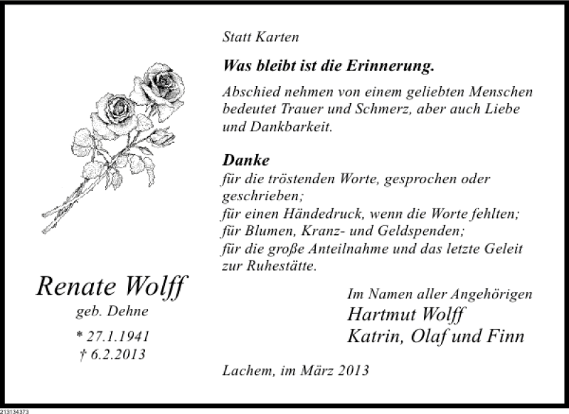 Hier finden Sie alle Traueranzeigen aus der Zeitung, die bisher für Renate Wolff erschienen sind. Weitere Traueranzeigen, die in der Zeitung erscheinen, werden hier ebenfalls aufgelistet