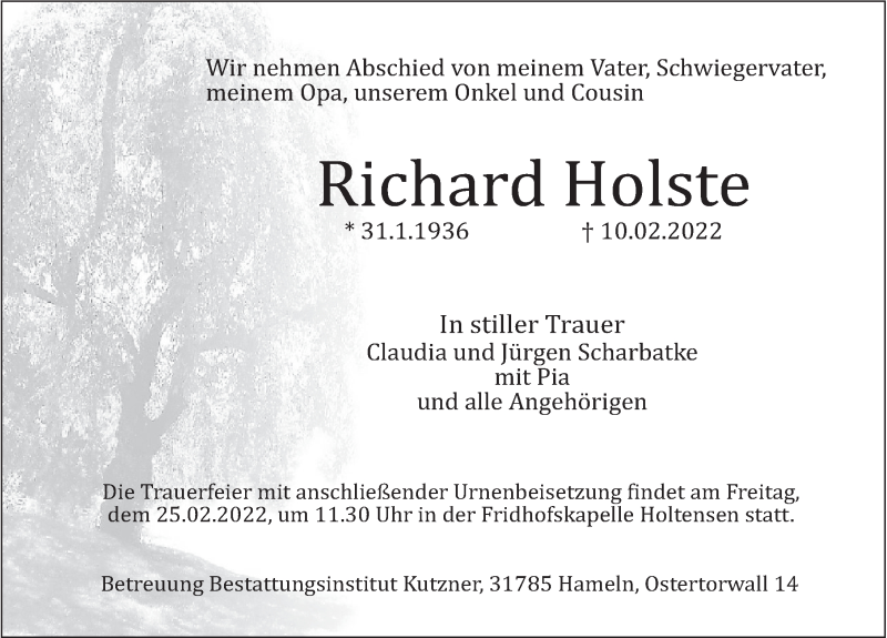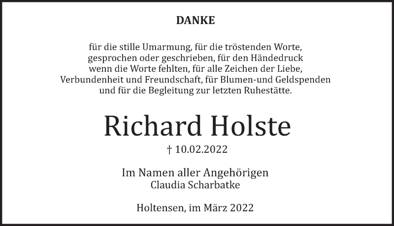 Hier finden Sie alle Traueranzeigen aus der Zeitung, die bisher für Richard Holste erschienen sind. Weitere Traueranzeigen, die in der Zeitung erscheinen, werden hier ebenfalls aufgelistet