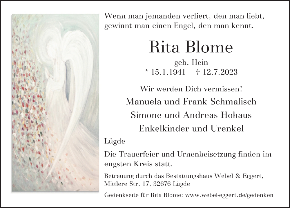 Hier finden Sie alle Traueranzeigen aus der Zeitung, die bisher für Rita Blome erschienen sind. Weitere Traueranzeigen, die in der Zeitung erscheinen, werden hier ebenfalls aufgelistet