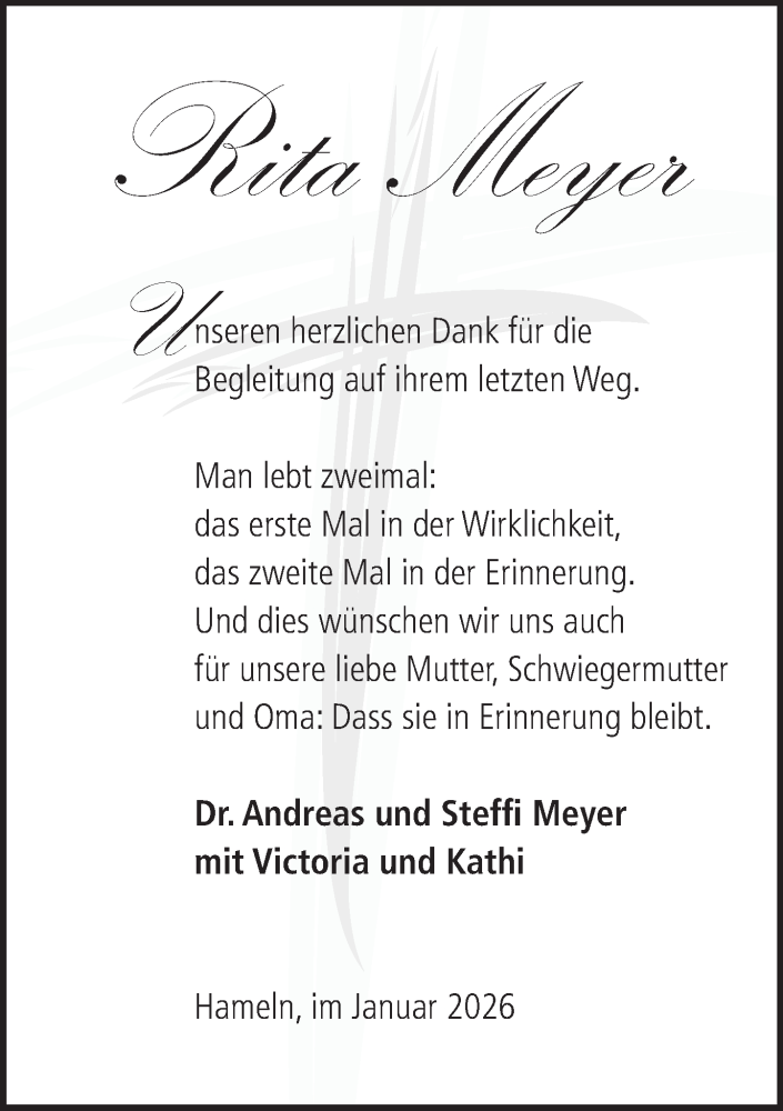 Hier finden Sie alle Traueranzeigen aus der Zeitung, die bisher für Rita Meyer erschienen sind. Weitere Traueranzeigen, die in der Zeitung erscheinen, werden hier ebenfalls aufgelistet