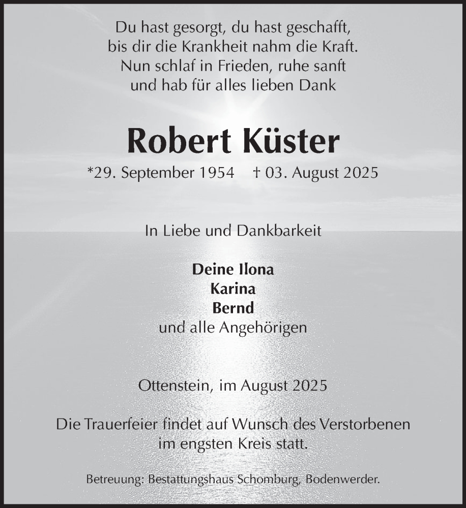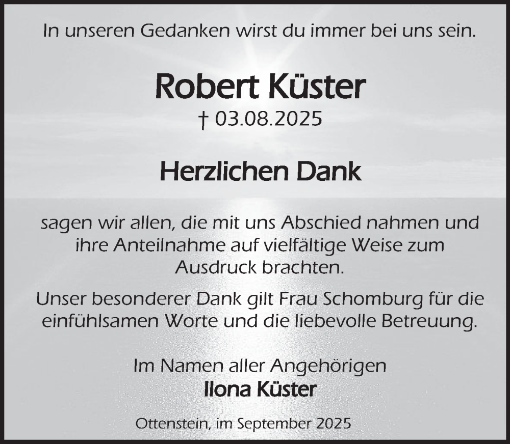 Hier finden Sie alle Traueranzeigen aus der Zeitung, die bisher für Robert Küster erschienen sind. Weitere Traueranzeigen, die in der Zeitung erscheinen, werden hier ebenfalls aufgelistet