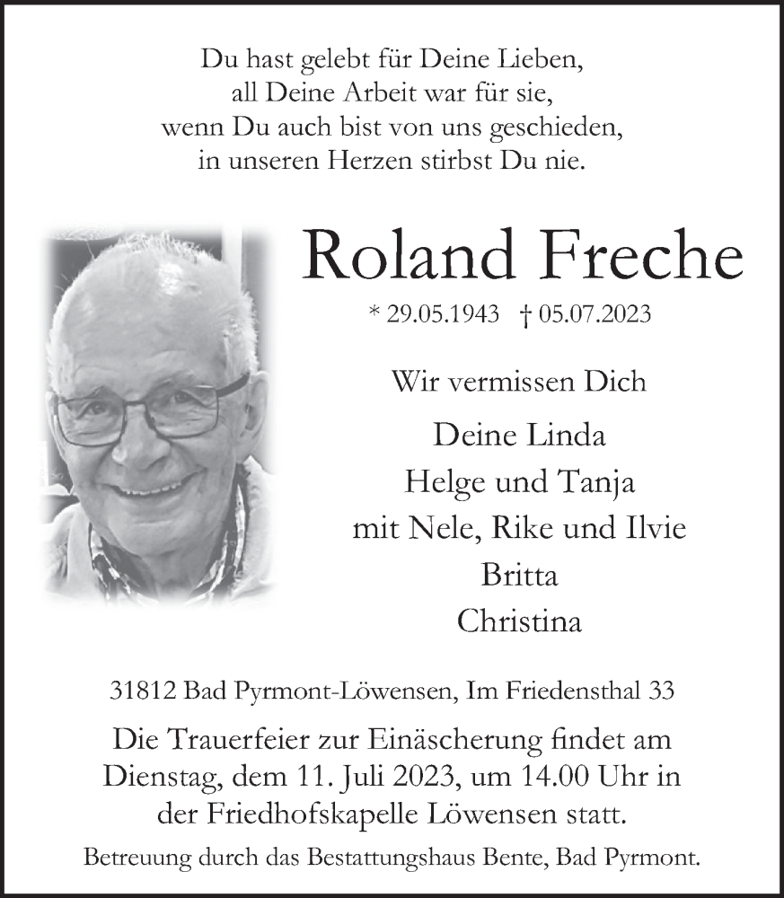 Hier finden Sie alle Traueranzeigen aus der Zeitung, die bisher für Roland Freche erschienen sind. Weitere Traueranzeigen, die in der Zeitung erscheinen, werden hier ebenfalls aufgelistet