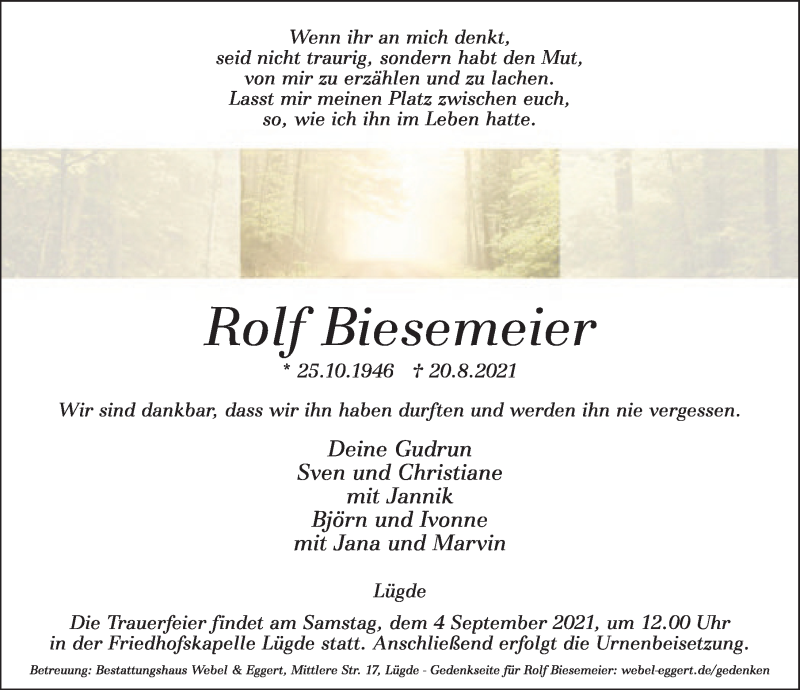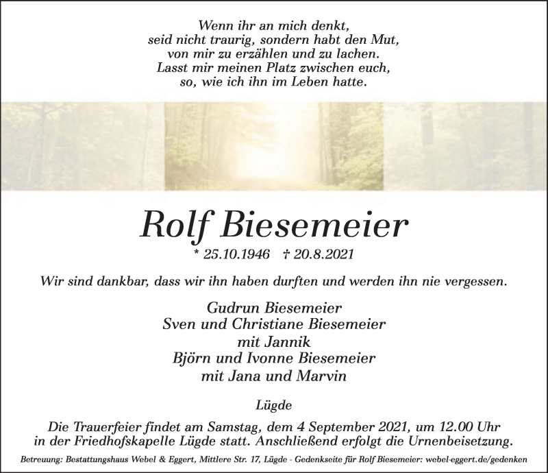Hier finden Sie alle Traueranzeigen aus der Zeitung, die bisher für Rolf Biesemeier erschienen sind. Weitere Traueranzeigen, die in der Zeitung erscheinen, werden hier ebenfalls aufgelistet