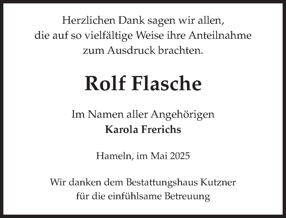 Hier finden Sie alle Traueranzeigen aus der Zeitung, die bisher für Rolf Flasche erschienen sind. Weitere Traueranzeigen, die in der Zeitung erscheinen, werden hier ebenfalls aufgelistet
