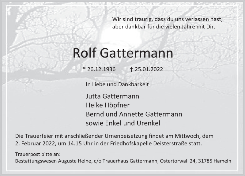 Hier finden Sie alle Traueranzeigen aus der Zeitung, die bisher für Rolf Gattermann erschienen sind. Weitere Traueranzeigen, die in der Zeitung erscheinen, werden hier ebenfalls aufgelistet