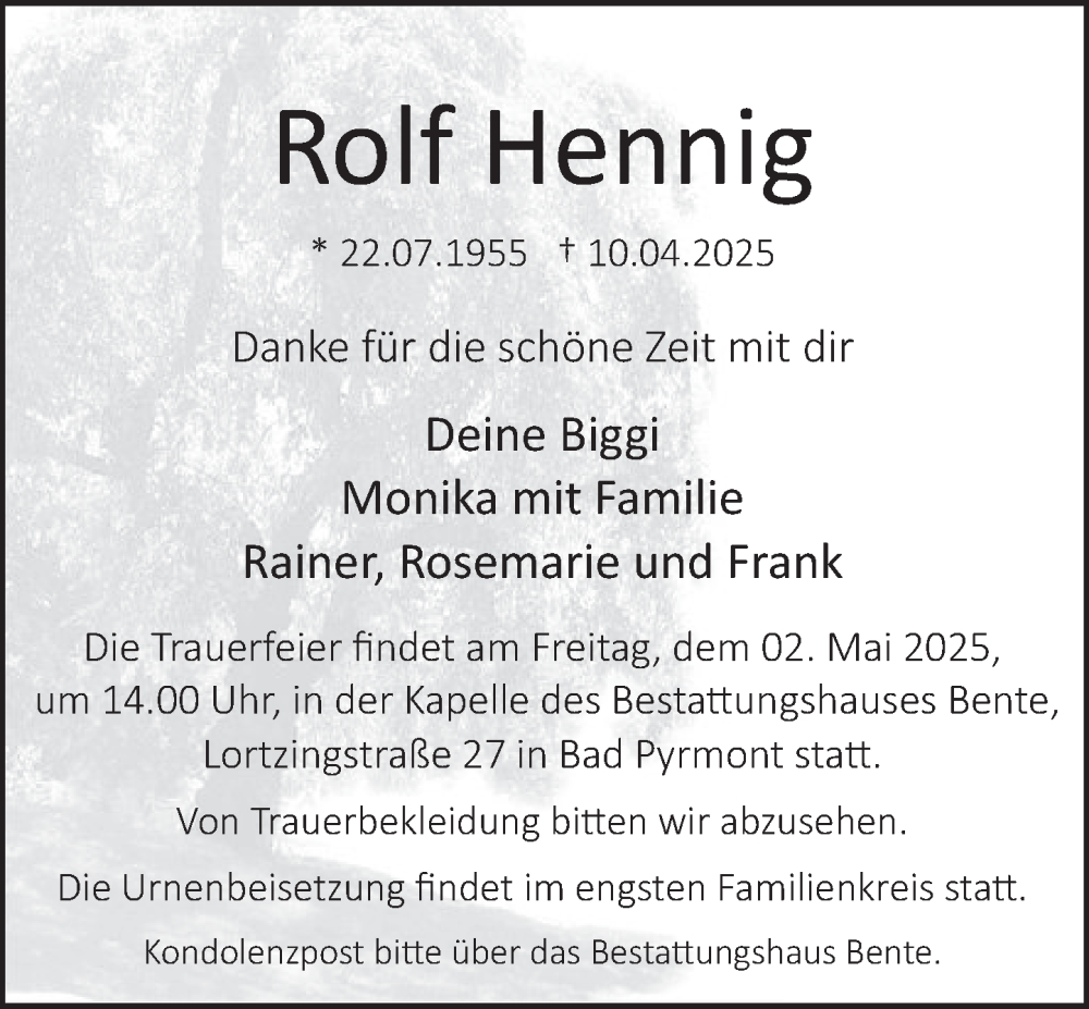 Hier finden Sie alle Traueranzeigen aus der Zeitung, die bisher für Rolf Hennig erschienen sind. Weitere Traueranzeigen, die in der Zeitung erscheinen, werden hier ebenfalls aufgelistet