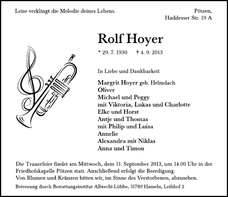 Hier finden Sie alle Traueranzeigen aus der Zeitung, die bisher für Rolf Hoyer erschienen sind. Weitere Traueranzeigen, die in der Zeitung erscheinen, werden hier ebenfalls aufgelistet