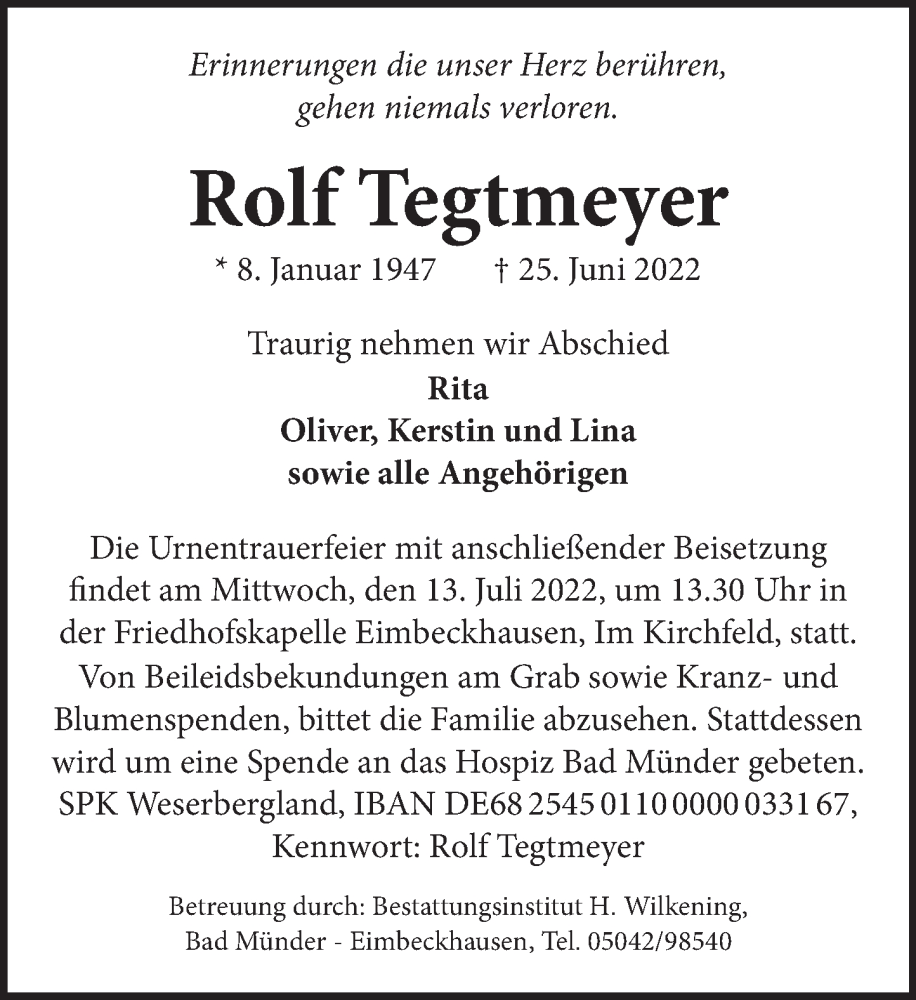 Hier finden Sie alle Traueranzeigen aus der Zeitung, die bisher für Rolf Tegtmeyer erschienen sind. Weitere Traueranzeigen, die in der Zeitung erscheinen, werden hier ebenfalls aufgelistet
