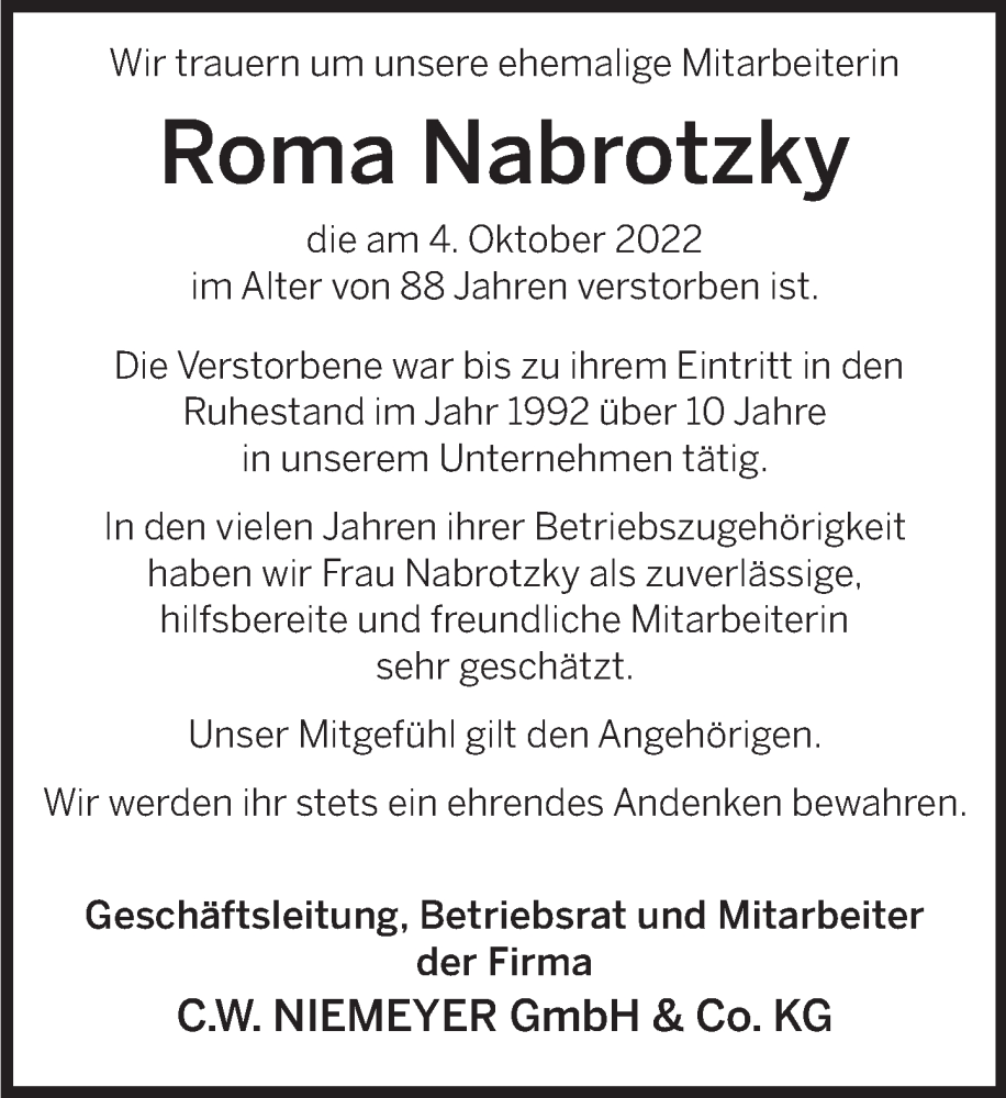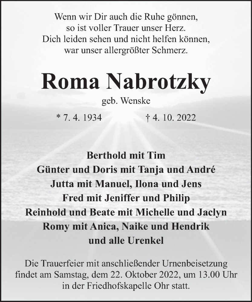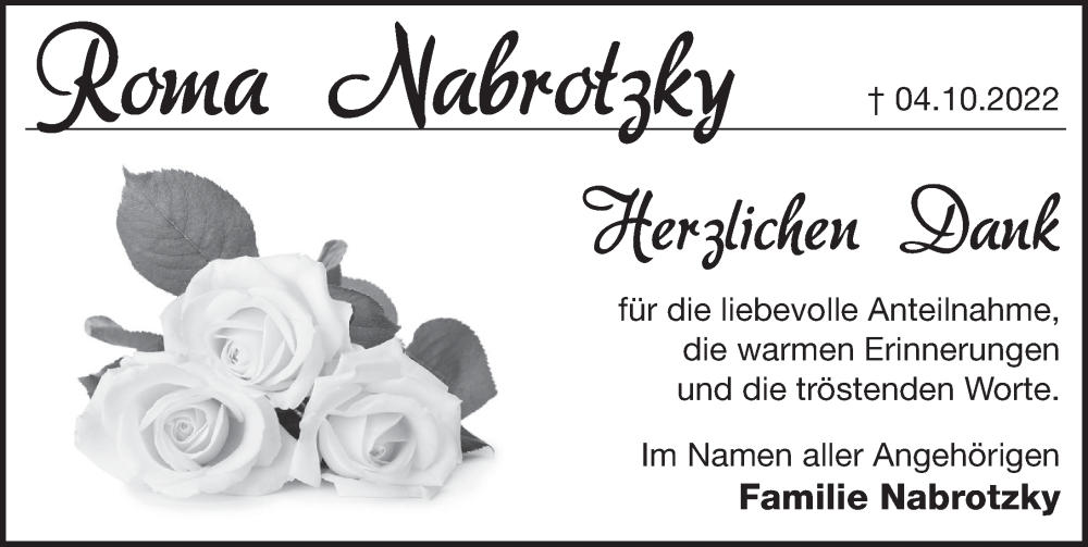 Hier finden Sie alle Traueranzeigen aus der Zeitung, die bisher für Roma Nabrotzky erschienen sind. Weitere Traueranzeigen, die in der Zeitung erscheinen, werden hier ebenfalls aufgelistet