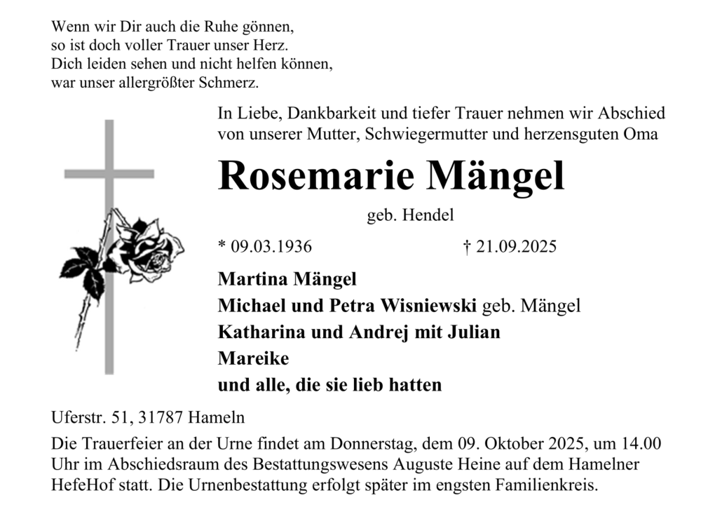 Hier finden Sie alle Traueranzeigen aus der Zeitung, die bisher für Rosemarie Mängel erschienen sind. Weitere Traueranzeigen, die in der Zeitung erscheinen, werden hier ebenfalls aufgelistet