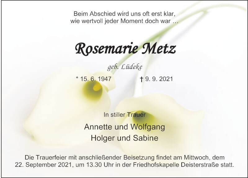 Hier finden Sie alle Traueranzeigen aus der Zeitung, die bisher für Rosemarie Metz erschienen sind. Weitere Traueranzeigen, die in der Zeitung erscheinen, werden hier ebenfalls aufgelistet