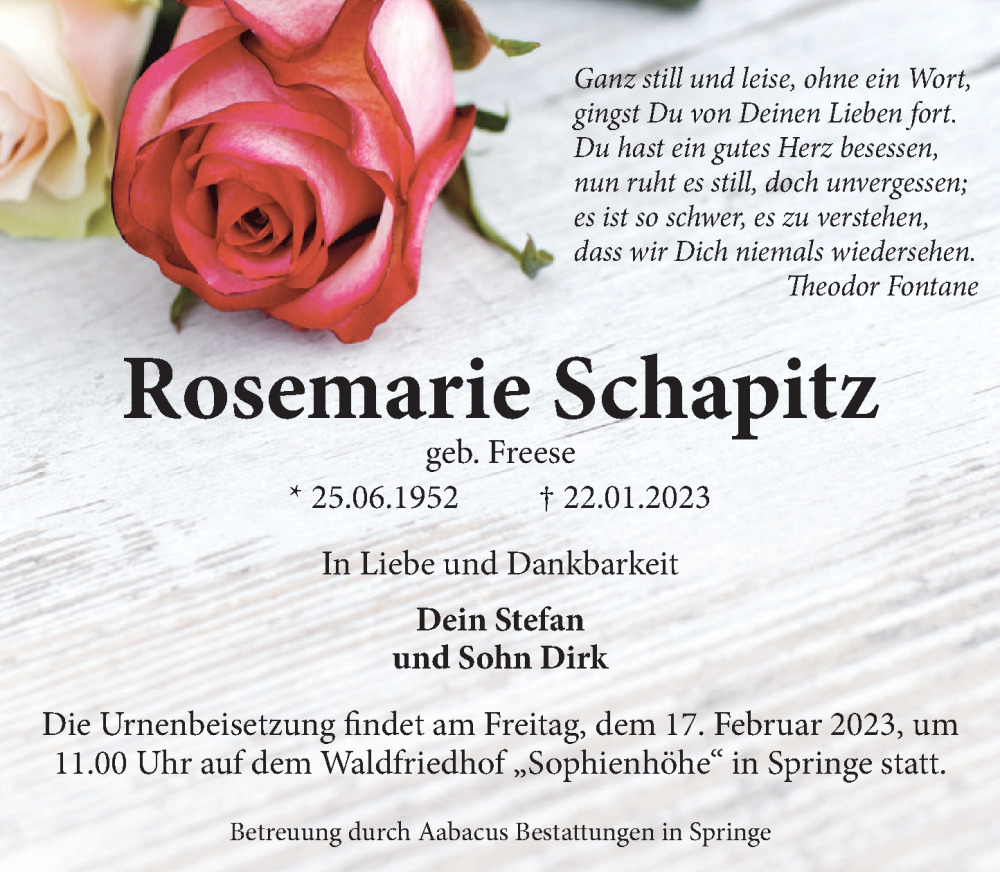 Hier finden Sie alle Traueranzeigen aus der Zeitung, die bisher für Rosemarie Schapitz erschienen sind. Weitere Traueranzeigen, die in der Zeitung erscheinen, werden hier ebenfalls aufgelistet