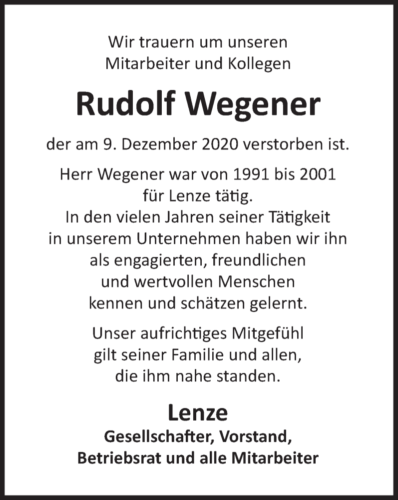 Hier finden Sie alle Traueranzeigen aus der Zeitung, die bisher für Rudolf Wegener erschienen sind. Weitere Traueranzeigen, die in der Zeitung erscheinen, werden hier ebenfalls aufgelistet