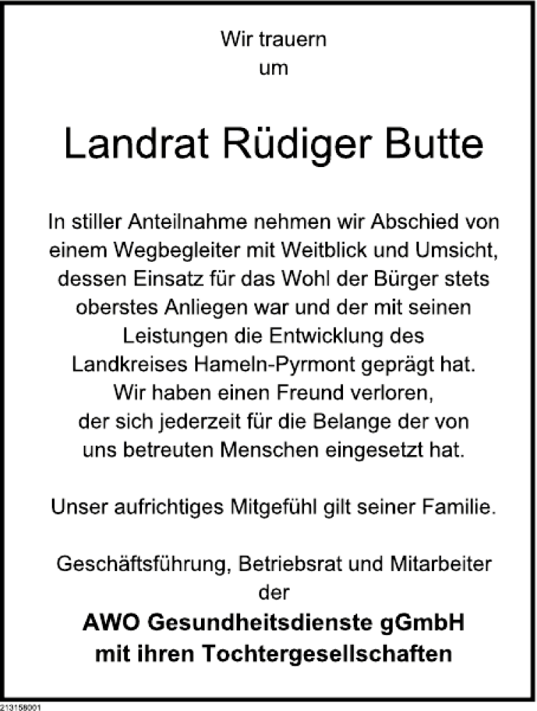 Hier finden Sie alle Traueranzeigen aus der Zeitung, die bisher für Rüdiger Butte erschienen sind. Weitere Traueranzeigen, die in der Zeitung erscheinen, werden hier ebenfalls aufgelistet