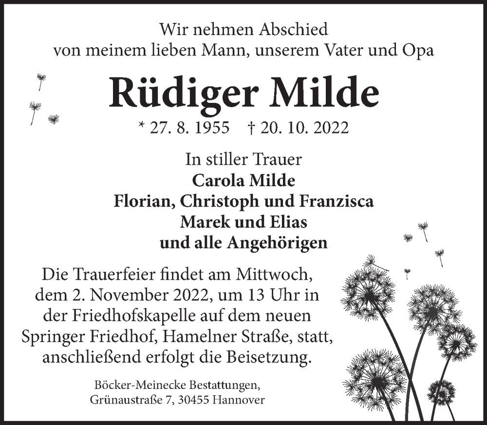 Hier finden Sie alle Traueranzeigen aus der Zeitung, die bisher für Rüdiger Milde erschienen sind. Weitere Traueranzeigen, die in der Zeitung erscheinen, werden hier ebenfalls aufgelistet