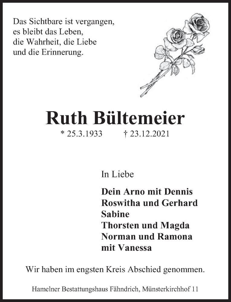 Hier finden Sie alle Traueranzeigen aus der Zeitung, die bisher für Ruth Bültemeier erschienen sind. Weitere Traueranzeigen, die in der Zeitung erscheinen, werden hier ebenfalls aufgelistet