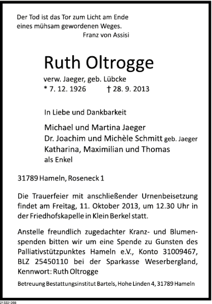 Hier finden Sie alle Traueranzeigen aus der Zeitung, die bisher für Ruth Oltrogge erschienen sind. Weitere Traueranzeigen, die in der Zeitung erscheinen, werden hier ebenfalls aufgelistet