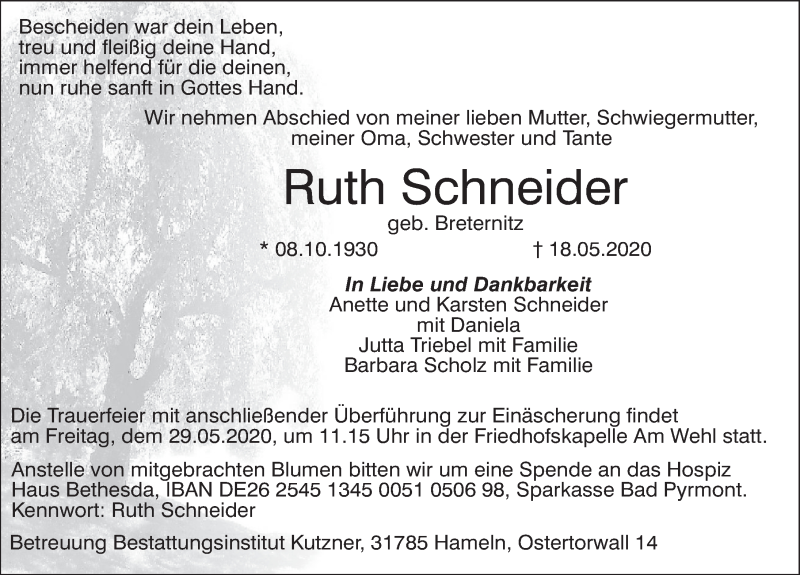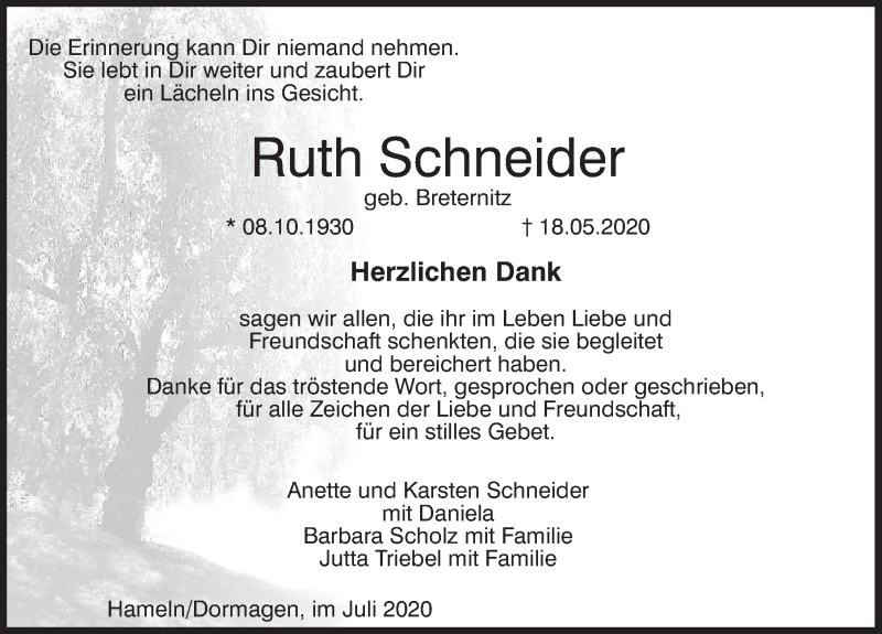 Hier finden Sie alle Traueranzeigen aus der Zeitung, die bisher für Ruth Schneider erschienen sind. Weitere Traueranzeigen, die in der Zeitung erscheinen, werden hier ebenfalls aufgelistet