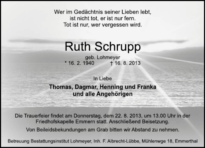 Hier finden Sie alle Traueranzeigen aus der Zeitung, die bisher für Ruth Schrupp erschienen sind. Weitere Traueranzeigen, die in der Zeitung erscheinen, werden hier ebenfalls aufgelistet