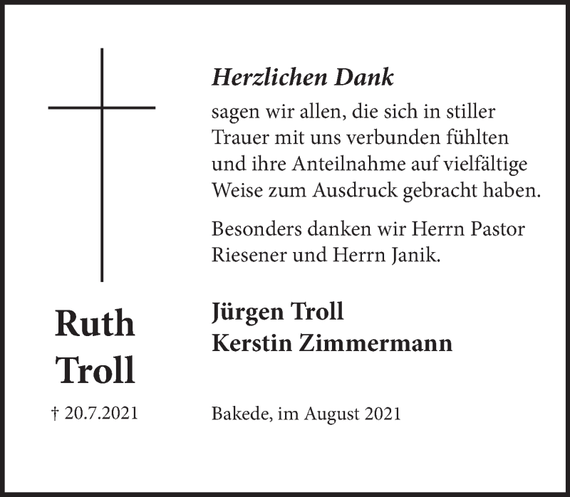 Hier finden Sie alle Traueranzeigen aus der Zeitung, die bisher für Ruth Troll erschienen sind. Weitere Traueranzeigen, die in der Zeitung erscheinen, werden hier ebenfalls aufgelistet