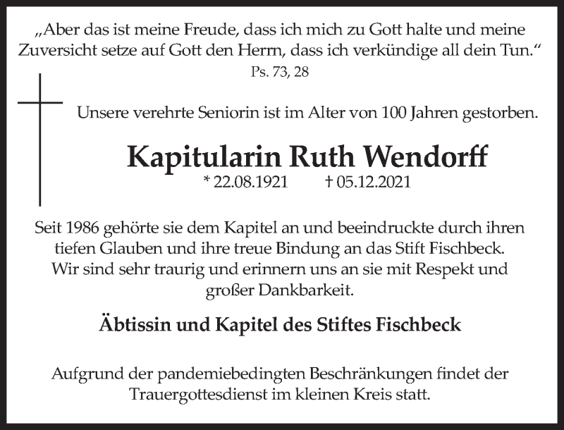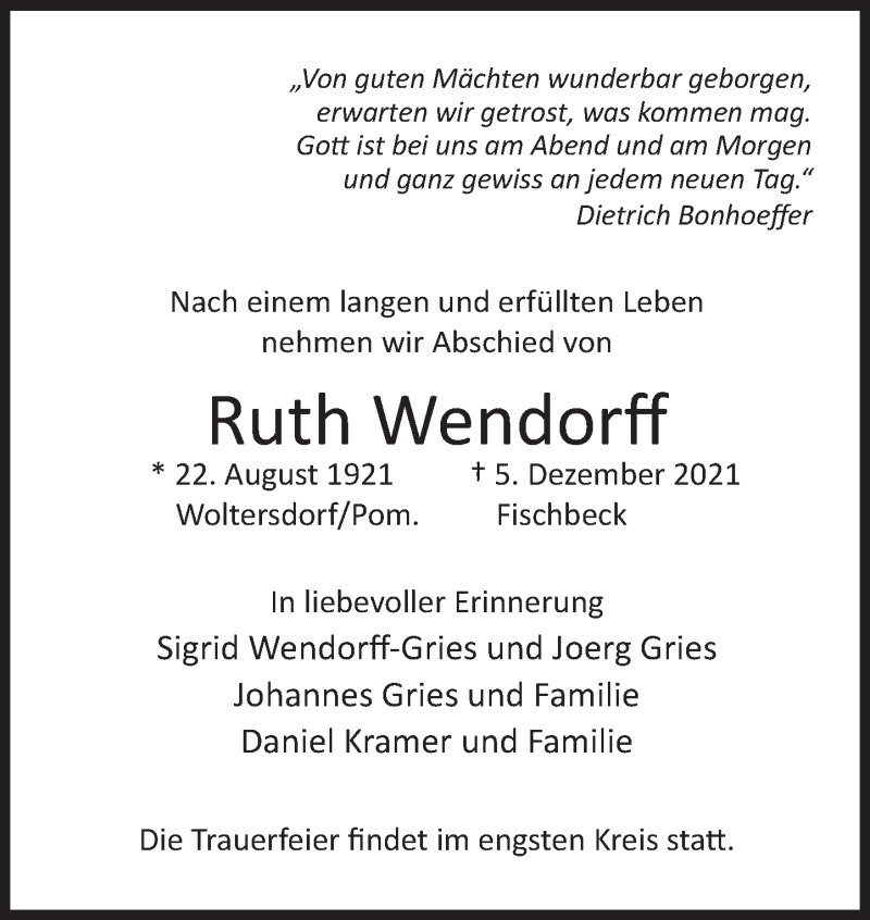 Hier finden Sie alle Traueranzeigen aus der Zeitung, die bisher für Ruth Wendorff erschienen sind. Weitere Traueranzeigen, die in der Zeitung erscheinen, werden hier ebenfalls aufgelistet