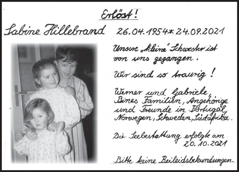 Hier finden Sie alle Traueranzeigen aus der Zeitung, die bisher für Sabine Hillebrand erschienen sind. Weitere Traueranzeigen, die in der Zeitung erscheinen, werden hier ebenfalls aufgelistet
