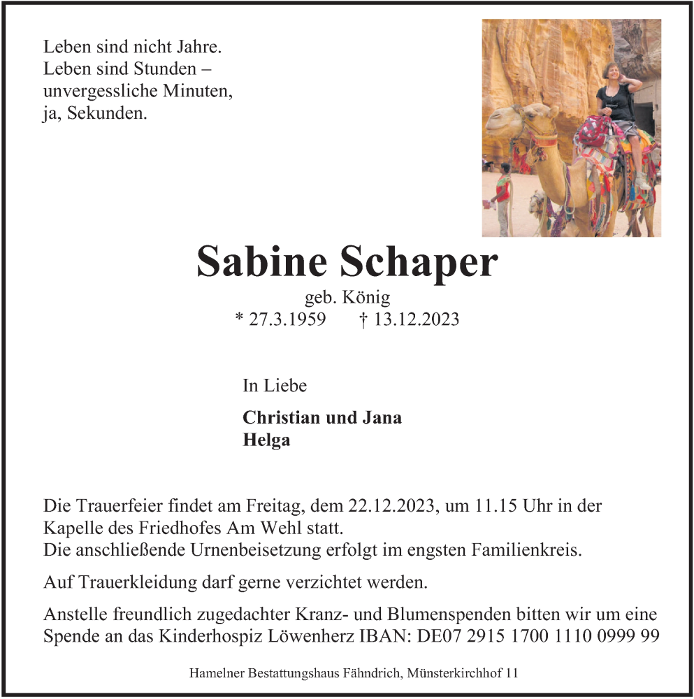 Hier finden Sie alle Traueranzeigen aus der Zeitung, die bisher für Sabine Schaper erschienen sind. Weitere Traueranzeigen, die in der Zeitung erscheinen, werden hier ebenfalls aufgelistet