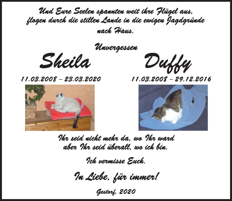 Hier finden Sie alle Traueranzeigen aus der Zeitung, die bisher für Sheila erschienen sind. Weitere Traueranzeigen, die in der Zeitung erscheinen, werden hier ebenfalls aufgelistet