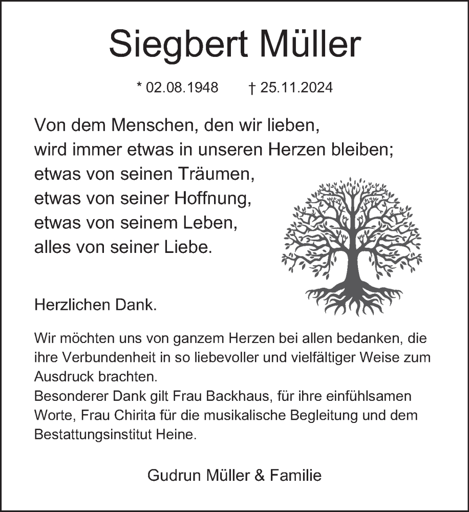 Hier finden Sie alle Traueranzeigen aus der Zeitung, die bisher für Siegbert Müller erschienen sind. Weitere Traueranzeigen, die in der Zeitung erscheinen, werden hier ebenfalls aufgelistet
