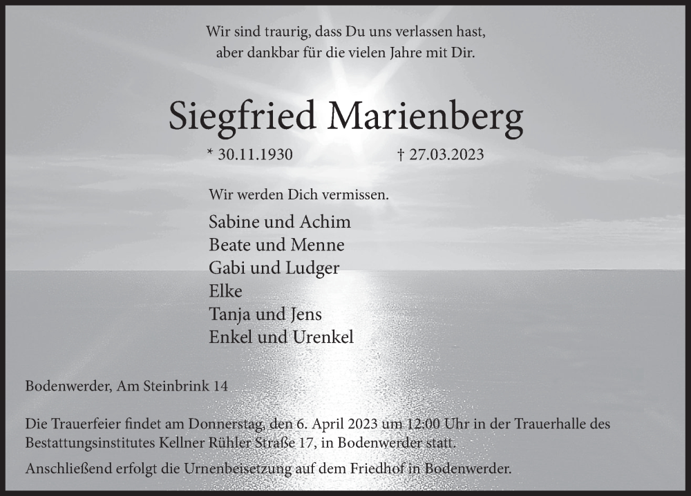 Hier finden Sie alle Traueranzeigen aus der Zeitung, die bisher für Siegfried Marienberg erschienen sind. Weitere Traueranzeigen, die in der Zeitung erscheinen, werden hier ebenfalls aufgelistet
