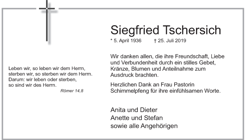 Hier finden Sie alle Traueranzeigen aus der Zeitung, die bisher für Siegfried Tschersich erschienen sind. Weitere Traueranzeigen, die in der Zeitung erscheinen, werden hier ebenfalls aufgelistet