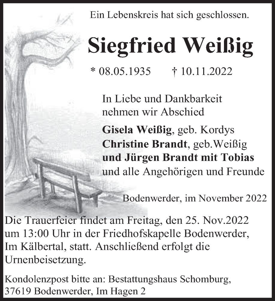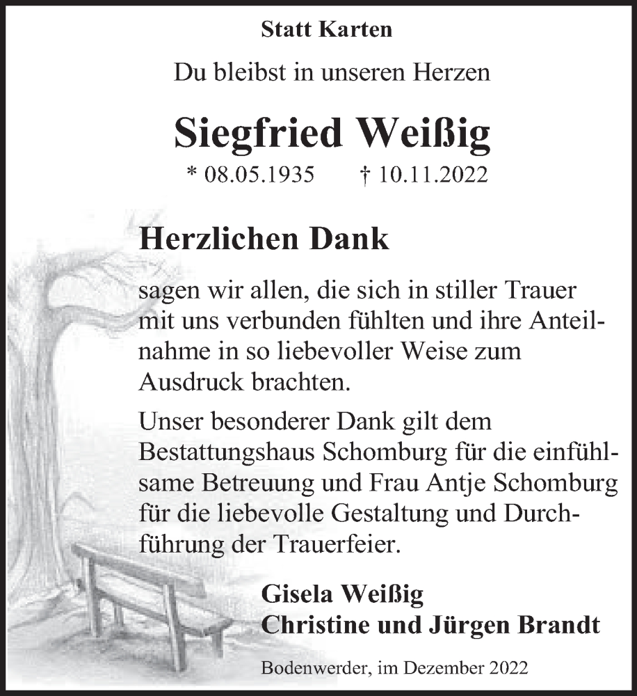 Hier finden Sie alle Traueranzeigen aus der Zeitung, die bisher für Siegfried Weißig erschienen sind. Weitere Traueranzeigen, die in der Zeitung erscheinen, werden hier ebenfalls aufgelistet
