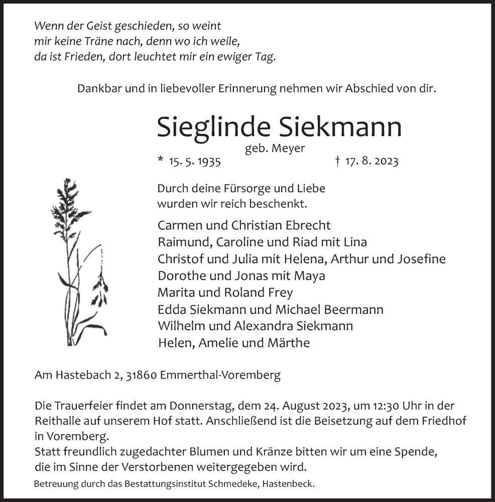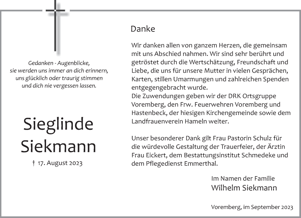 Hier finden Sie alle Traueranzeigen aus der Zeitung, die bisher für Sieglinde Siekmann erschienen sind. Weitere Traueranzeigen, die in der Zeitung erscheinen, werden hier ebenfalls aufgelistet
