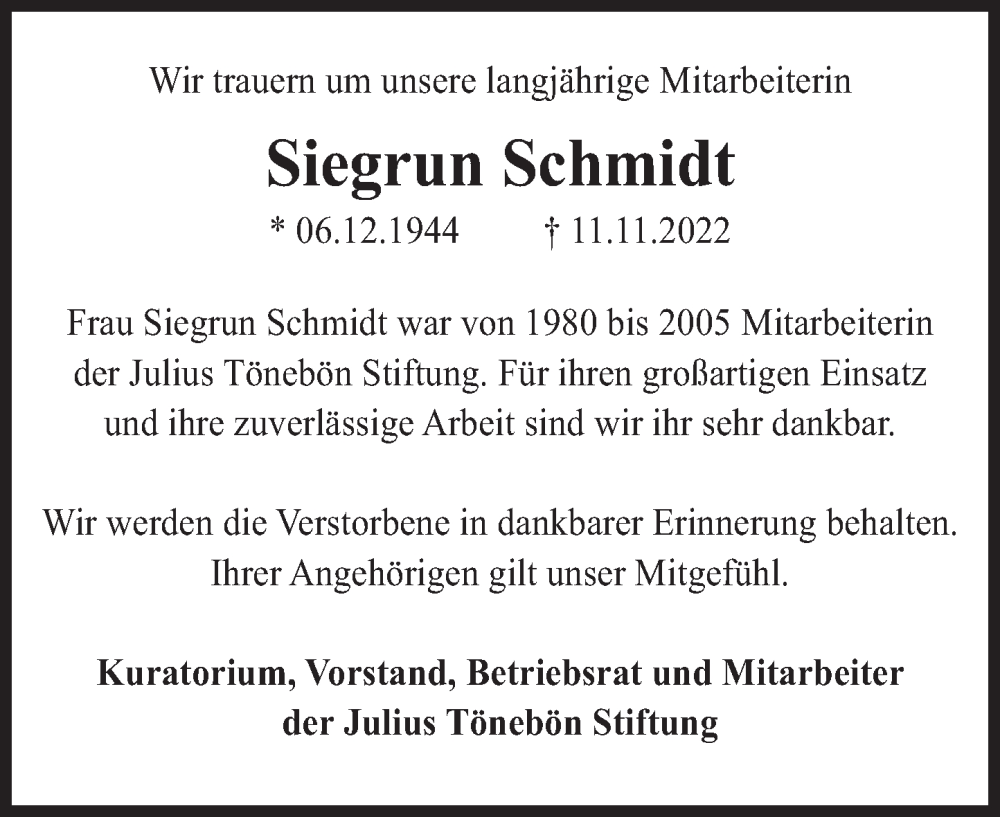 Hier finden Sie alle Traueranzeigen aus der Zeitung, die bisher für Siegrun Schmidt erschienen sind. Weitere Traueranzeigen, die in der Zeitung erscheinen, werden hier ebenfalls aufgelistet