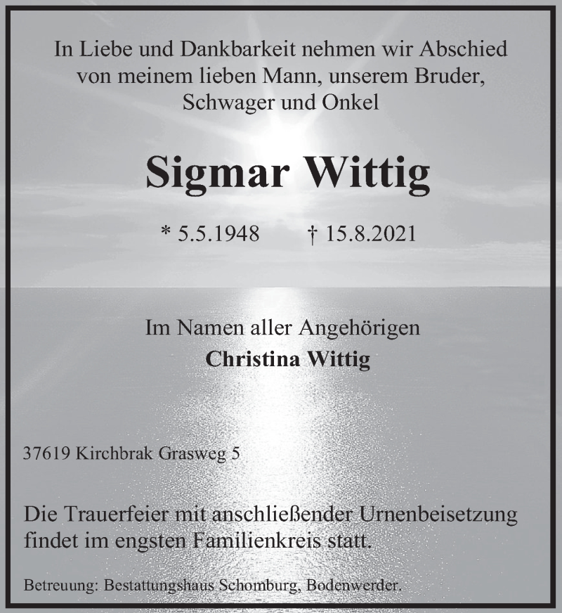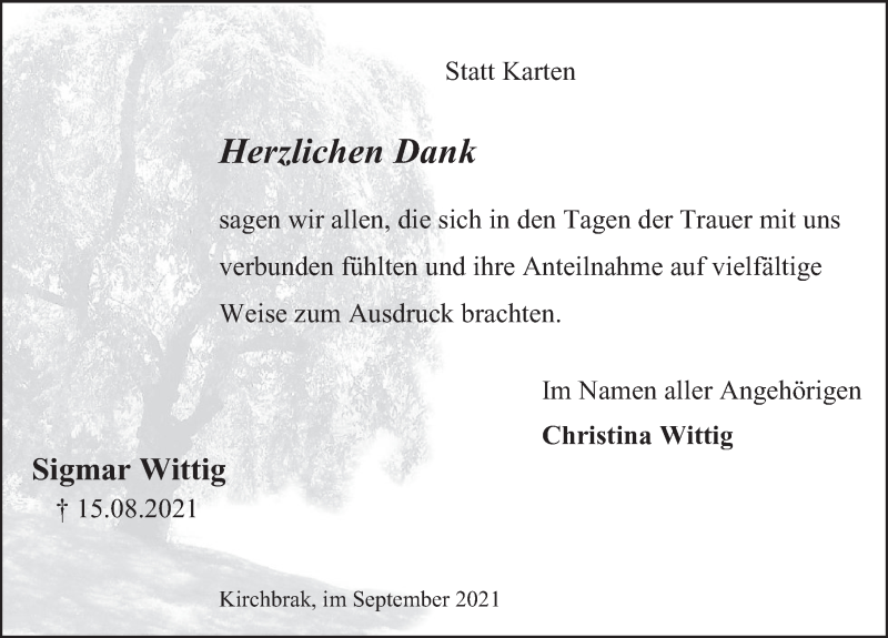 Hier finden Sie alle Traueranzeigen aus der Zeitung, die bisher für Sigmar Wittig erschienen sind. Weitere Traueranzeigen, die in der Zeitung erscheinen, werden hier ebenfalls aufgelistet
