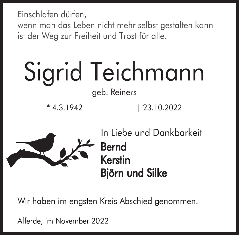 Hier finden Sie alle Traueranzeigen aus der Zeitung, die bisher für Sigrid Teichmann erschienen sind. Weitere Traueranzeigen, die in der Zeitung erscheinen, werden hier ebenfalls aufgelistet
