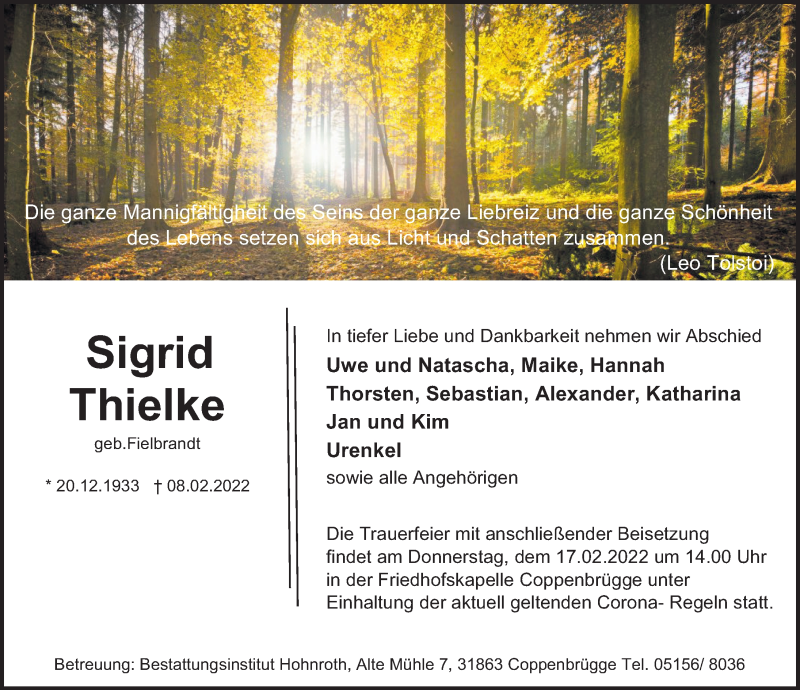 Hier finden Sie alle Traueranzeigen aus der Zeitung, die bisher für Sigrid Thielke erschienen sind. Weitere Traueranzeigen, die in der Zeitung erscheinen, werden hier ebenfalls aufgelistet