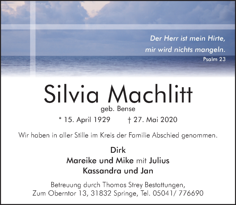 Hier finden Sie alle Traueranzeigen aus der Zeitung, die bisher für Silvia Machlitt erschienen sind. Weitere Traueranzeigen, die in der Zeitung erscheinen, werden hier ebenfalls aufgelistet