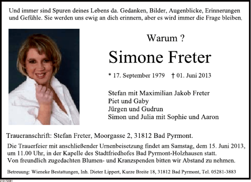 Hier finden Sie alle Traueranzeigen aus der Zeitung, die bisher für Simone Freter erschienen sind. Weitere Traueranzeigen, die in der Zeitung erscheinen, werden hier ebenfalls aufgelistet