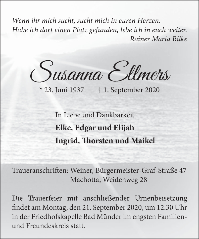 Hier finden Sie alle Traueranzeigen aus der Zeitung, die bisher für Susanna Ellmers erschienen sind. Weitere Traueranzeigen, die in der Zeitung erscheinen, werden hier ebenfalls aufgelistet
