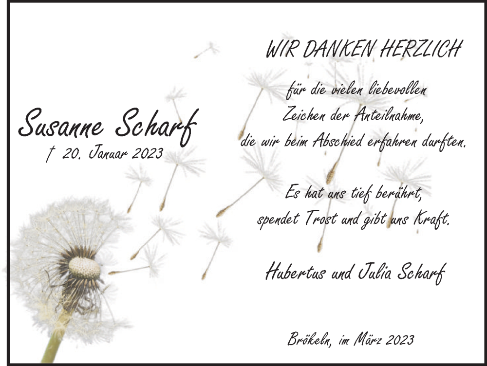 Hier finden Sie alle Traueranzeigen aus der Zeitung, die bisher für Susanne Scharf erschienen sind. Weitere Traueranzeigen, die in der Zeitung erscheinen, werden hier ebenfalls aufgelistet