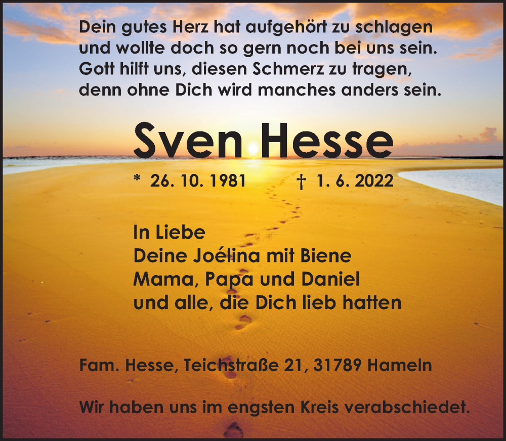 Hier finden Sie alle Traueranzeigen aus der Zeitung, die bisher für Sven Hesse erschienen sind. Weitere Traueranzeigen, die in der Zeitung erscheinen, werden hier ebenfalls aufgelistet
