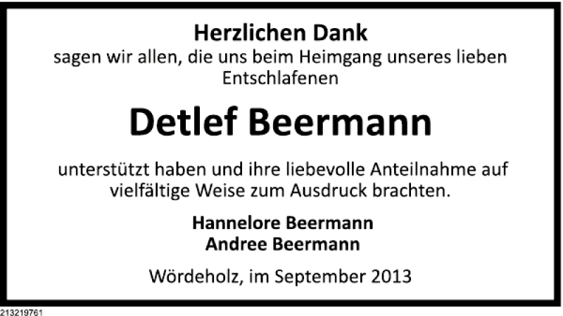 Hier finden Sie alle Traueranzeigen aus der Zeitung, die bisher für TD Detlef Beermann erschienen sind. Weitere Traueranzeigen, die in der Zeitung erscheinen, werden hier ebenfalls aufgelistet