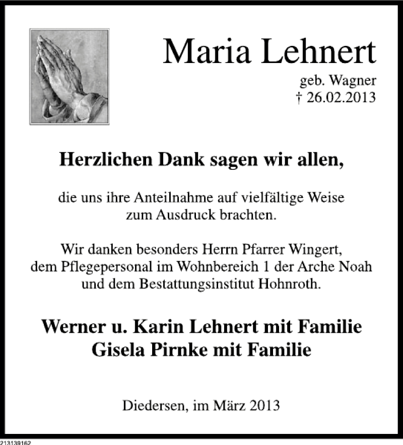 Hier finden Sie alle Traueranzeigen aus der Zeitung, die bisher für TD Maria Lehnert erschienen sind. Weitere Traueranzeigen, die in der Zeitung erscheinen, werden hier ebenfalls aufgelistet