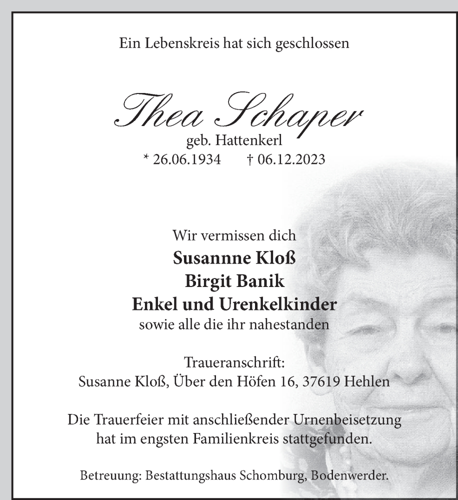 Hier finden Sie alle Traueranzeigen aus der Zeitung, die bisher für Thea Schaper erschienen sind. Weitere Traueranzeigen, die in der Zeitung erscheinen, werden hier ebenfalls aufgelistet