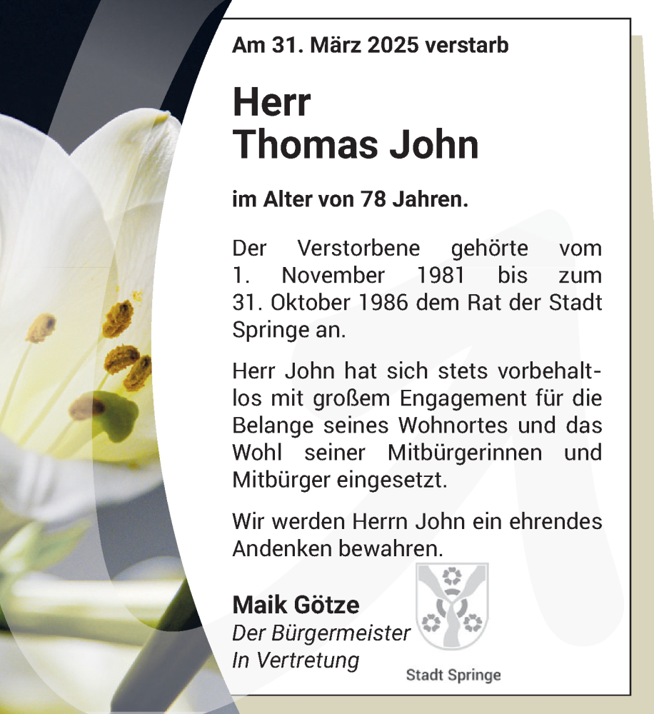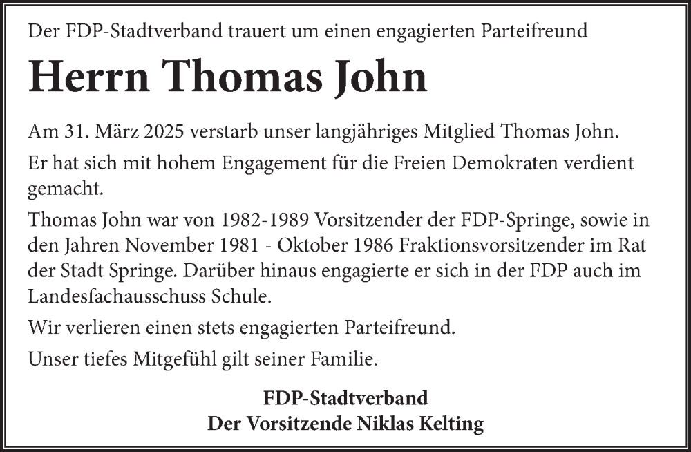 Hier finden Sie alle Traueranzeigen aus der Zeitung, die bisher für Thomas John erschienen sind. Weitere Traueranzeigen, die in der Zeitung erscheinen, werden hier ebenfalls aufgelistet