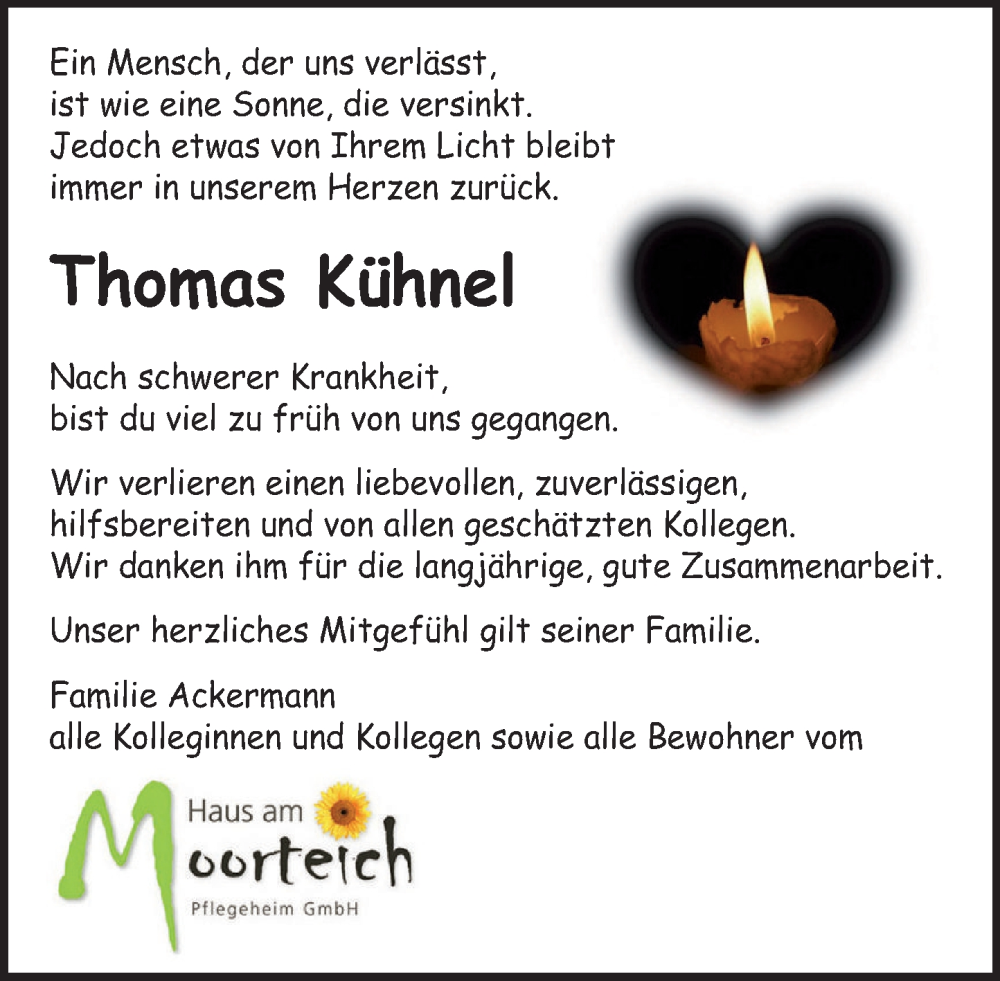 Hier finden Sie alle Traueranzeigen aus der Zeitung, die bisher für Thomas Kühnel erschienen sind. Weitere Traueranzeigen, die in der Zeitung erscheinen, werden hier ebenfalls aufgelistet
