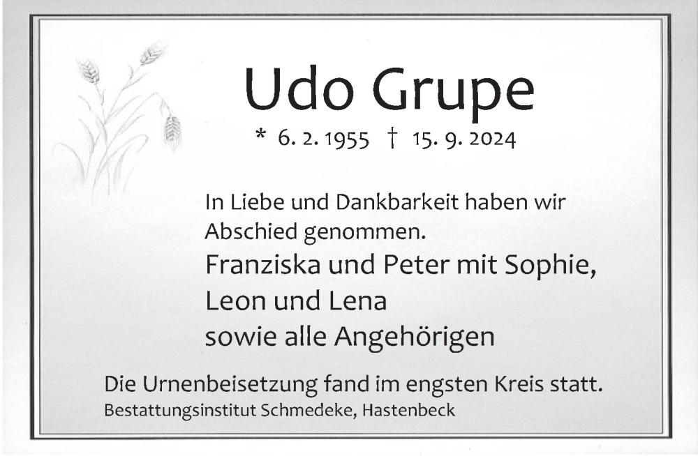 Hier finden Sie alle Traueranzeigen aus der Zeitung, die bisher für Udo Grupe erschienen sind. Weitere Traueranzeigen, die in der Zeitung erscheinen, werden hier ebenfalls aufgelistet
