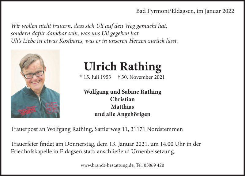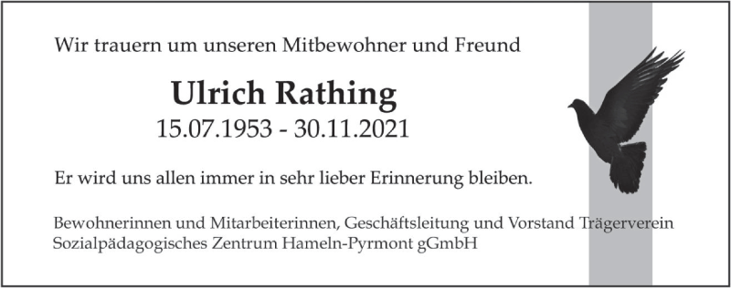 Hier finden Sie alle Traueranzeigen aus der Zeitung, die bisher für Ulrich Rathing erschienen sind. Weitere Traueranzeigen, die in der Zeitung erscheinen, werden hier ebenfalls aufgelistet